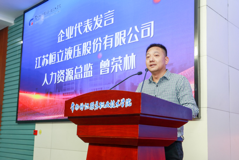 江苏恒立液压股份有限公司人力资源总监曾荣林作为顶岗实习企业代表发言,他详细介绍了公司情况,表示将严格落实学生实习管理规定,扎实落实顶岗实习学生的指导工作,希望今后与机电学院继续深化在人才培养输送方面的合作,为经济社会发展培养更多具有工匠精神的高素质技术技能人才。