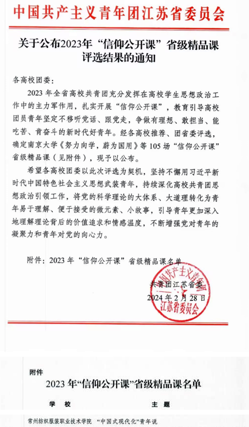 近日,共青团江苏省委公布2023年“信仰公开课”省级精品课评选结果。我校申报的《“中国式现代化”青年说》获评2023年“信仰公开课”省级精品课。