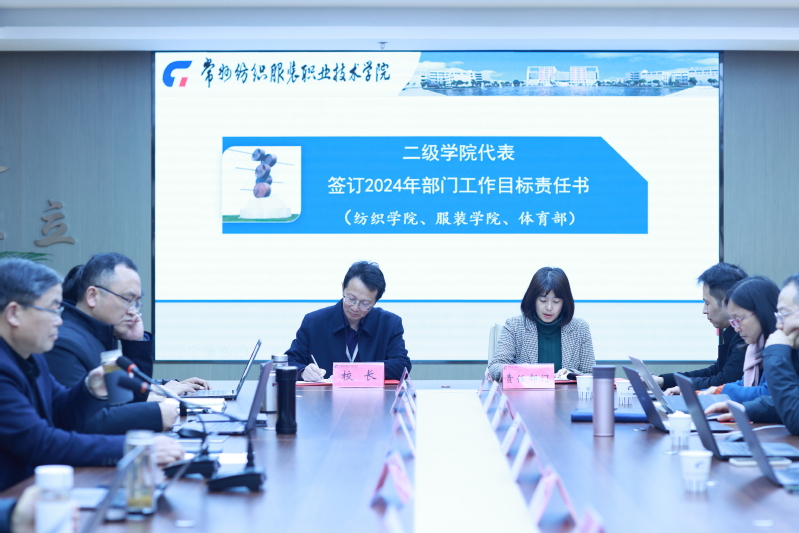党委副书记、校长洪霄代表学校,分别与职能部门代表教务处、科技处、人事处以及二级学院代表智能纺织与材料学院、服装与时尚设计学院、体育部签订了《2024年部门工作目标责任书》。