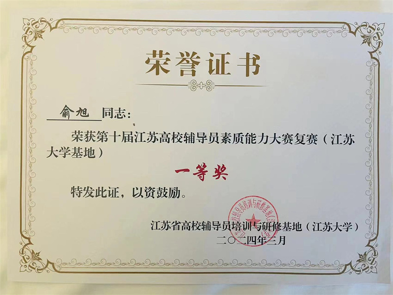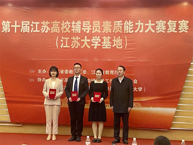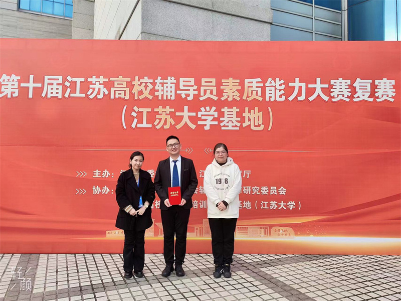 3月27日—28日,由江苏省委教育工委、江苏省教育厅主办,江苏省高等教育学会辅导员工作研究委员会、江苏省高校辅导员培训与研修基地(江苏大学)协办的第十届江苏高校辅导员素质能力大赛复赛圆满落幕。来自镇江、常州、无锡三个地区高职高专院校的20名辅导员同台竞技,经过激烈角逐,我校人文与健康学院辅导员俞旭以第2名成绩斩获一等奖,成功晋级省赛决赛,取得我校辅导员在该项赛事中的历史最好成绩。