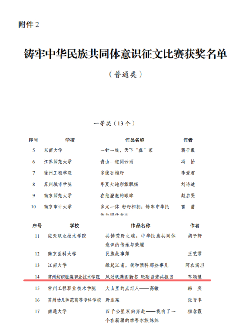 据悉,江苏省第一届“铸牢中华民族共同体意识·高校在行动”系列活动覆盖全省160多所高校,本专科院校同台竞技,累计40余万人次参加。其中有98 所高校推荐 474 篇稿件参加征文比赛,我校机关党工委车颖慧同志的《风劲帆满图新志砥砺吾辈共担当》荣获铸牢中华民族共同体意识征文比赛(普通类)一等奖。