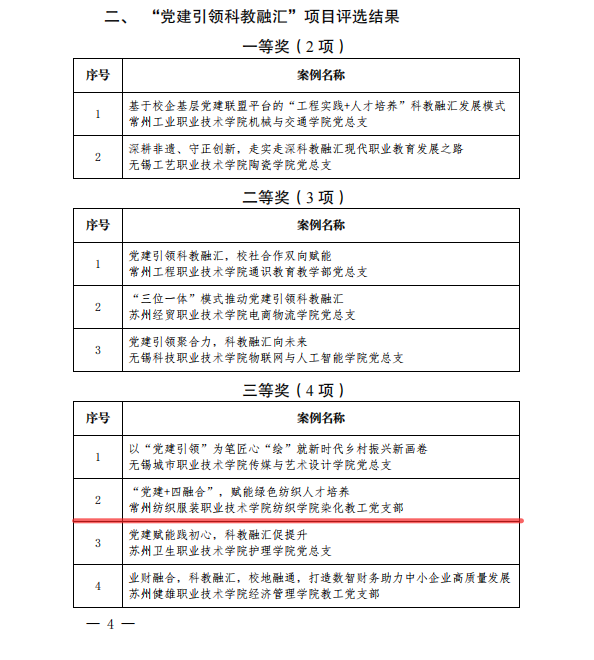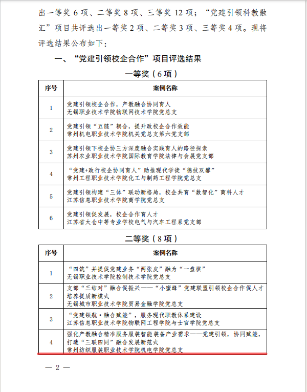 在苏锡常都市圈职业教育党建联盟理事会组织的2023年“党建引领校企合作”“党建引领科教融汇”优秀案例评选中,我校智能制造学院党总支报送的《强化产教融合精准服务服装智能装备产业需求——党建引领,协同赋能,打造“三联四同”融合发展新范式》荣获“党建引领校企合作”优秀案例二等奖,智能纺织与材料学院党总支染化教工党支部报送的《“党建+四融合”,赋能绿色纺织人才培养》荣获“党建引领科教融汇”优秀案例三等奖。