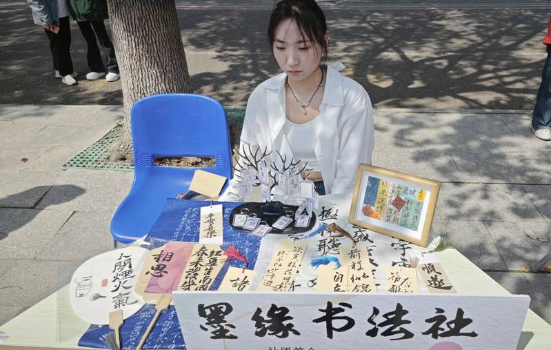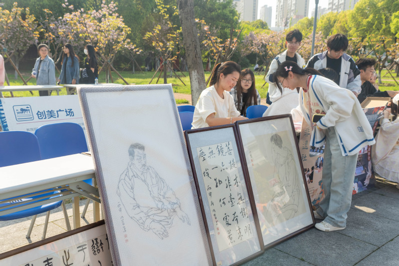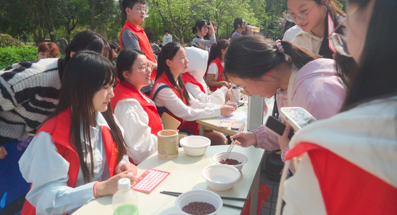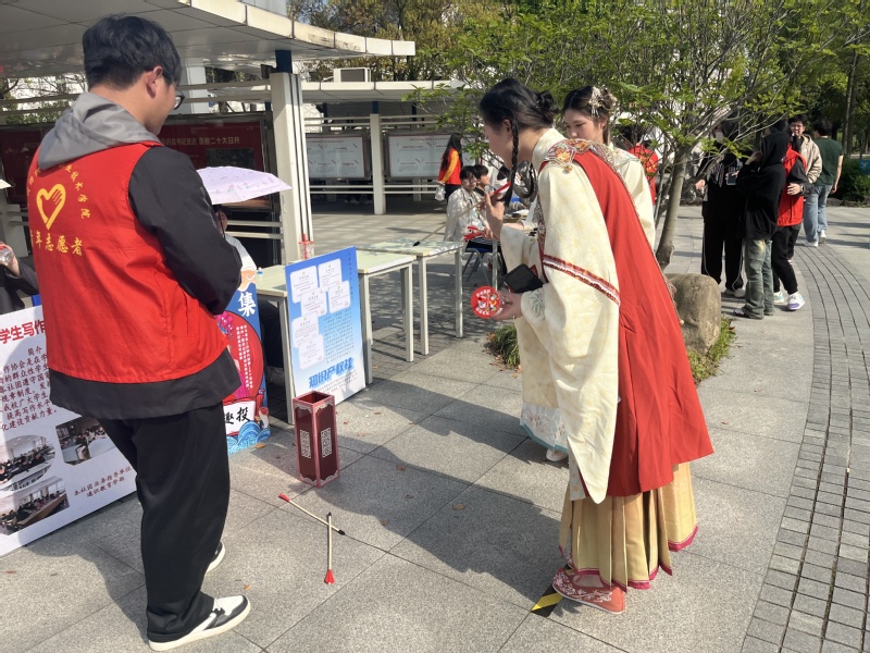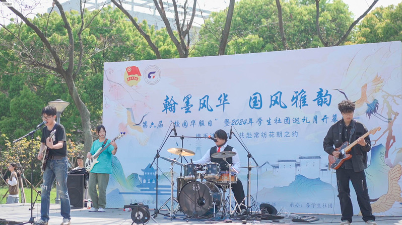 活动在脉搏乐队《闹海》等歌曲的激情开唱中火热开场,常武国学社带来的华服秀以中华礼乐文化为切入点,围绕‘礼之敬’这一主题,聚焦传承中华优秀传统文化、打造了一台贴近青年口味的华服秀典,绝美的妆造和精妙的舞韵引得师生和摄影爱好者们纷纷驻足观赏拍照。国画社的“雅风绘扇”活动让师生们在扇面上绘制心中的美景,传递着艺术与美的追求。留青竹刻社的“竹韵华章”则以精湛的雕刻技艺展现竹子的高洁与韵味。霓裳直播社发挥社团特色,对现场活动进行了精彩的直播,墨缘书法社、非遗社、剪纸社等41个学生社团以独特的方式呈现了传统文化的魅力。同时,“轻拈红豆”“壶艺趣投”“飞花令”等雅集游戏更是增加了活动的趣味性,备受师生喜爱和追捧。此外,今年的社团巡礼还特别加入了百草根集市和非遗美食体验环节,让师生们在享受文化盛宴的同时,也能边品尝地道的非遗美食边感受淘淘淘的乐趣。