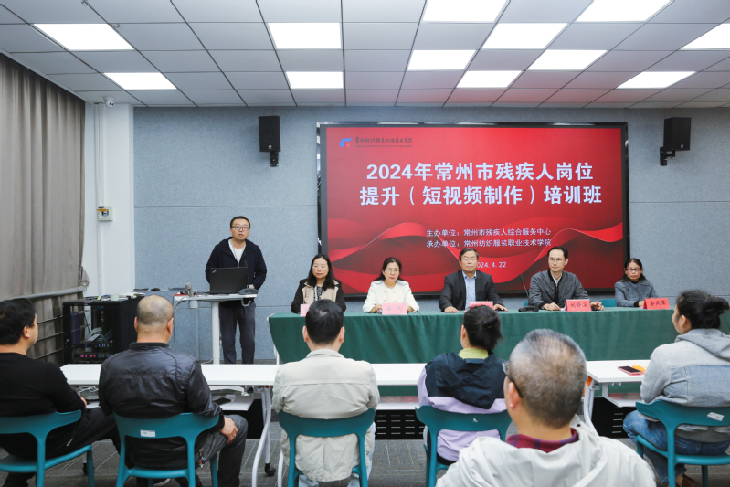 为积极响应国家对残疾人就业创业的政策扶持,提升残疾人职业技能水平,4月23日,由常州市残疾人联合会资助、常州市残疾人综合服务中心主办、常州纺织服装职业技术学院承办的2024年常州市残疾人岗位提升(短视频制作)培训,在创意设计学院8130会议室举行了开班仪式。常州市残疾人综合服务中心主任刘静涵、培训科科长查燕萍,我校党委委员、副校长张文明,继续教育学院院长姜燕,创意设计学院党总支书记祝燕芳,创意设计学院副院长武传奇,培训项目负责人曹承进、培训班班主任吴旦以及30位培训班学员参加了开班仪式。