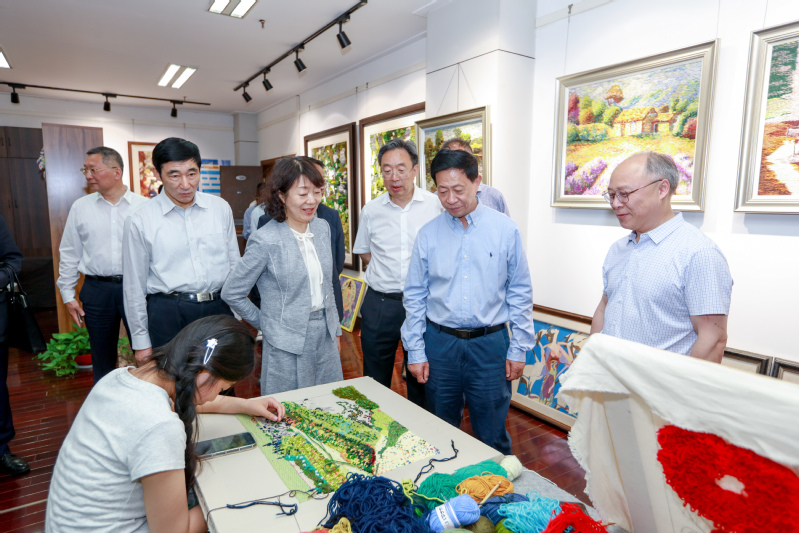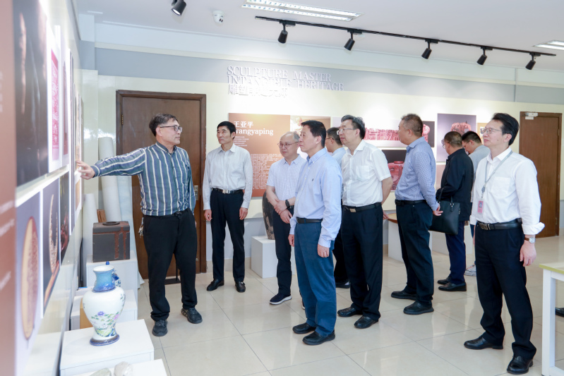 胡刚一行来到我校文化传承与创新中心,了解我校在中华优秀传统文化的创造性转化和创新性发展情况。仔细观看了在故宫博物院展出的数字文化艺术作品《舣舟亭》,特别听取了创意设计学院副院长何卫平结合数字技术对传统国画的三维数字化创作的典型案例。胡刚一行走进纤维艺术工作室、服饰文化馆、梳篦、陶艺、剪纸等工作室,听取了文化传承与创新中心顾明智教授细致的介绍,对我校坚持特色发展,坚持育训并举,深化产教融合等方面给予充分肯定。