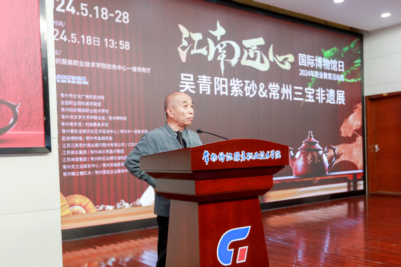 随后中国紫砂非遗传承人吴青阳先生致辞。他表示作为宜兴紫砂手艺人,有责任和义务为常州纺院做出应有的贡献,刚刚成立的“陶瓷实训基地”,也将进一步拉近宜兴紫砂与常州纺织的紧密文化艺术交流与合作。现场播放了中国工艺美术大师葛军大师的祝贺视频,通过祝贺视频传达了他对展览的关注与支持。