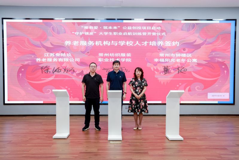 开营仪式上,“守护银发”大学生职业启航训练营支持江苏小云网络传媒有限公司与项目执行方天福志愿服务中心签署了合作协议。常州纺织服装职业技术学院和江苏叁陆玖养老服务有限公司、常州市钟楼区幸福阳光老年公寓签署了人才培养协议。