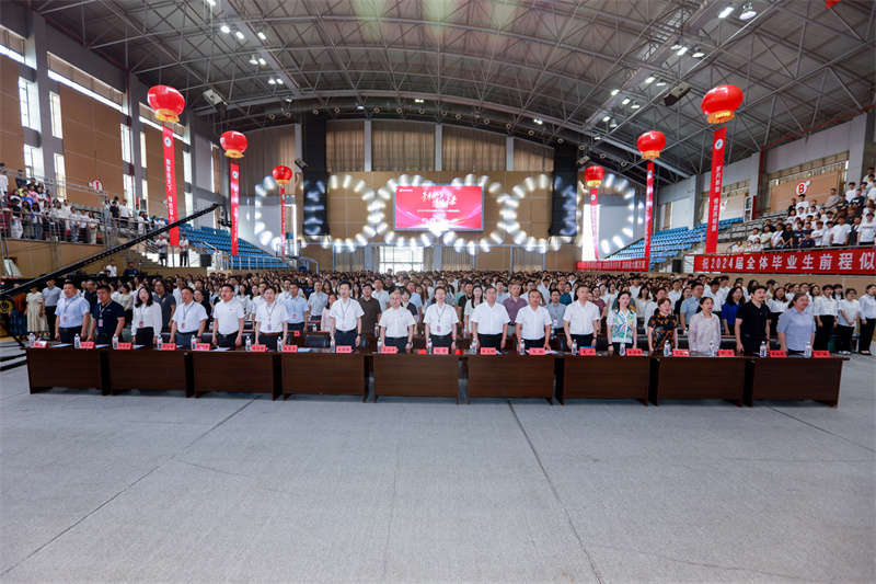 典礼在庄严的国歌声中拉开帷幕。学校党委书记吴访升向同学们致辞,他代表学校党政和全体师生员工向圆满完成学业、即将踏上人生新征程的全体毕业生表达了殷切的祝福。他结合当下的时代背景、经济技术发展现状,寄语全体毕业生永葆“三心”,勇敢面对世界之变、时代之变、历史之变。希望毕业生们挺膺担当,永葆奋进之心;持续学习,永葆创新之心;脚踏实地,永葆感恩之心,继续秉持母校“进德 立业 敏学 笃行”的校训,一步一个脚印往前走、攀高峰,一笔一画写人生、绘华年,走好脚下成才之路。