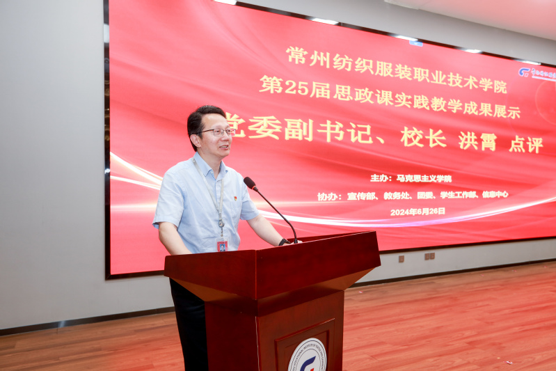 从再现瞿秋白大义勇为的革命家风采到深情演绎赵一曼写给儿子的一封信的感人画面,从还原南昌起义的关键时刻到深入阐释何为抗战精神及其内涵……6月26日下午,常州纺织服装职业技术学院第25届思政课实践教学成果展示活动在领秀展厅隆重举办。党委副书记、校长洪霄,党委委员、纪委书记林素琴,团委书记朱鹏、信息中心主任廖定安、教务处副处长许晓宇、学工处副处长李鹏、思政课教师、学生代表等100余人参加了展示活动。此次活动由马克思主义学院主办,宣传部、教务处、团委、学生工作部、信息中心联合协办。