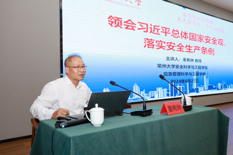 常州大学安全科学与工程学院董希琳教授以“领会习近平总体国家安全观,落实安全生产条例”为题,从习近平总体国家安全观、安全生产十五条措施、高等院校的消防安全重点工作三个层面,给大家带来了一场生动详实的报告。