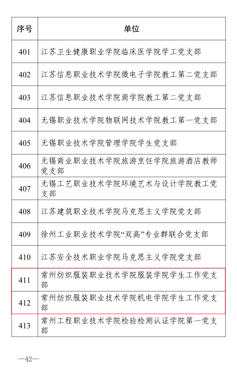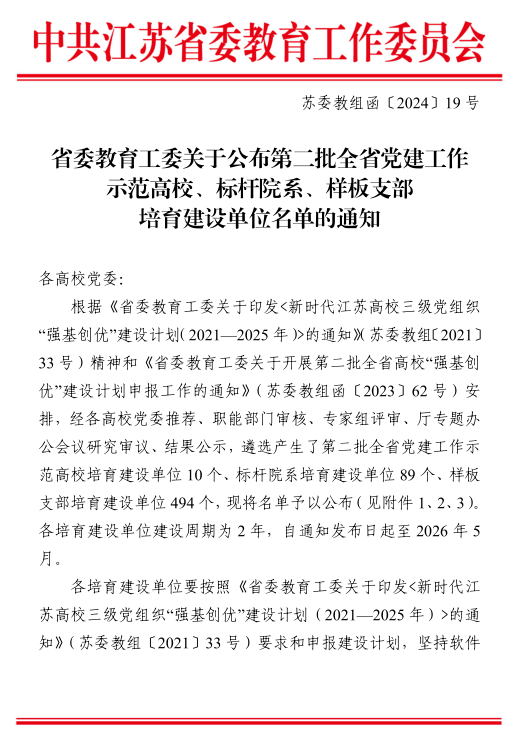 近日,江苏省委教育工委发文公布第二批全省建党工作示范高校、标杆院系、样板支部培育建设单位名单,我校服装与时尚设计学院学生工作党支部、智能制造学院学生工作党支部获批“第二批全省党建工作样板支部”培育建设单位。