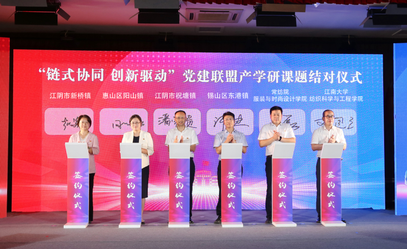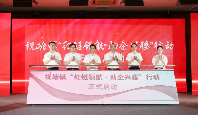 本次活动共分为“织‘链’启航 党旗飘扬”、“红‘链’赋能 蓄力而为”、“聚‘链’成群 共绘蓝图”三个篇章。镇人大主席马军在致辞中表示要坚持以“党建链”赋能“产业链”,通过党建引领,着力整合纺织服装行业市场、资金、人才、技术等资源,助推链上企业发展上规模、党建上台阶。随后,江南大学纺织科学与工程学院、常州纺院服装与时尚设计学院、东港镇、祝塘镇、新桥镇、阳山镇共同进行了“链式协同创新驱动”党建联盟产学研课题结对签约仪式。江阴市委组织部副部长、市级机关工委书记周麒,江南大学纺织科学与工程学院教授、博士生导师刘建立,常纺院党委委员、组织部部长高江荣,江阴市委社会工作部副部长汤中一,江阴市工信局副局长庞远超,祝塘镇党委副书记严枫共同启动祝塘镇“红链领航·助企兴塍”行动。