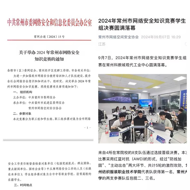 2024年9月7日,常州市网络安全知识竞赛学生组决赛在常州科教城现代工业中心圆满落幕。我校智能制造学院信息安全技术应用专业派出两支队伍参赛,学生们表现出色。常桂坤、刘威、嵇柯团队在比赛中荣获一等奖(指导老师:裴浩、肖华枫),陈伧、刘高、谢宛苏团队则获得二等奖(指导老师:游小荣、陆玉亭),充分展现了扎实的专业知识和出色的团队协作能力。