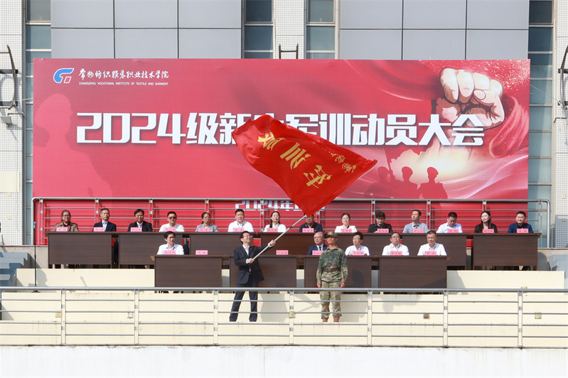 烈日当空,艳阳高照,在升国旗仪式后,洪霄向纪兴龙中校授军训旅旗,王顺明宣读《关于成立常纺院2024级学生军训工作组织机构的决定》。