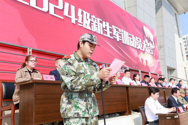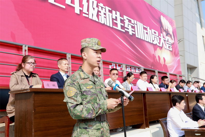 军训学员代表刘周尧号召全体新生认真学习军事技能,增强国防意识,坚决服从管理,发扬集体主义精神,在军训的锤炼中发扬革命传统,继承红色基因,赓续精神血脉,在艰苦训练中磨炼自己的意志。