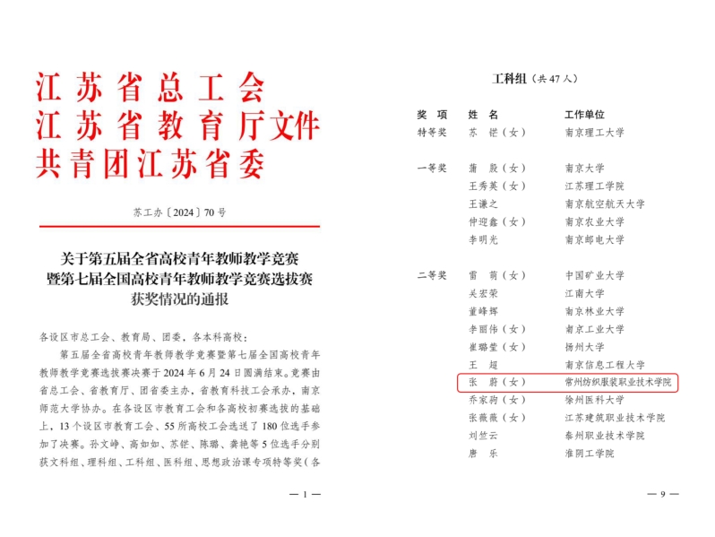 2024年6月21至24日,第五届江苏省高校青年教师教学竞赛暨第七届全国高校青年教师教学竞赛选拔赛在南京师范大学仙林校区举行,我校智能制造学院张蔚老师荣获工科组二等奖。