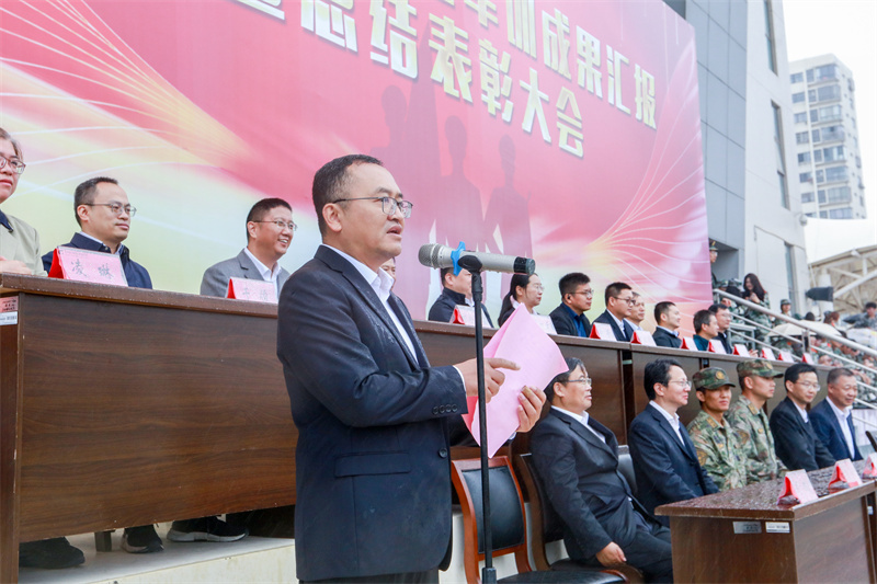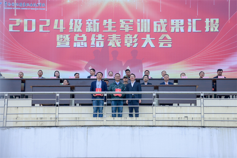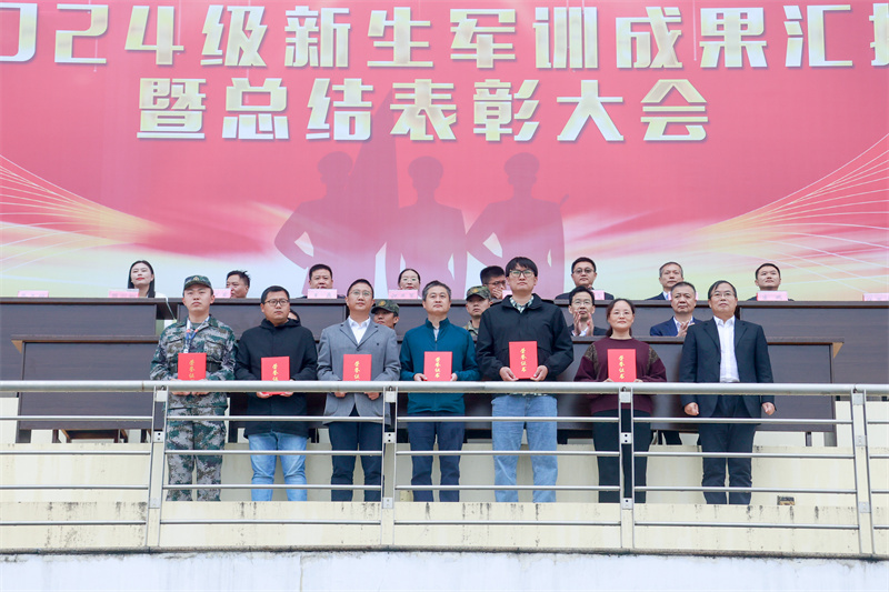 紧接着,大会进入了表彰环节。党委副书记、校长洪霄向承训部队赠送了锦旗,以表达学校对部队官兵辛勤付出的感激之情。马昀宣读了多项表彰决定,包括优秀教官、优秀政委、优秀参谋、优秀教导员、优秀学员、队列标兵、作风纪律标兵、内务标兵及优秀军训团等荣誉的获得者。在颁奖环节,党委副书记王顺明,党委委员、副校长张文明,党委委员、宣传部部长夏斌以及洪霄校长等领导分别为获奖者颁发了荣誉证书。这些荣誉的获得,不仅是对获奖者个人努力的肯定,更是对全体新生军训期间辛勤付出的认可。