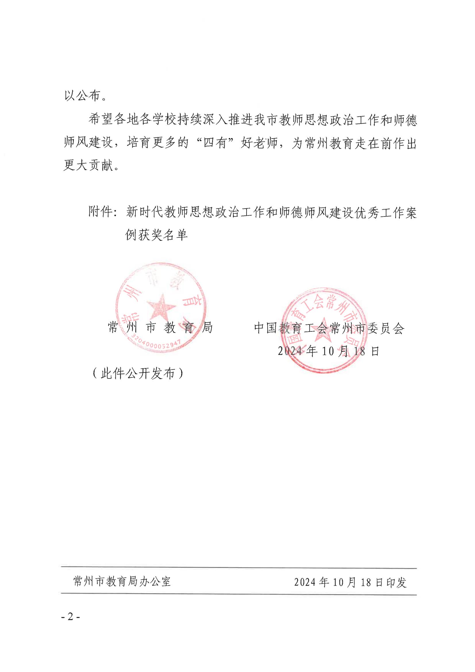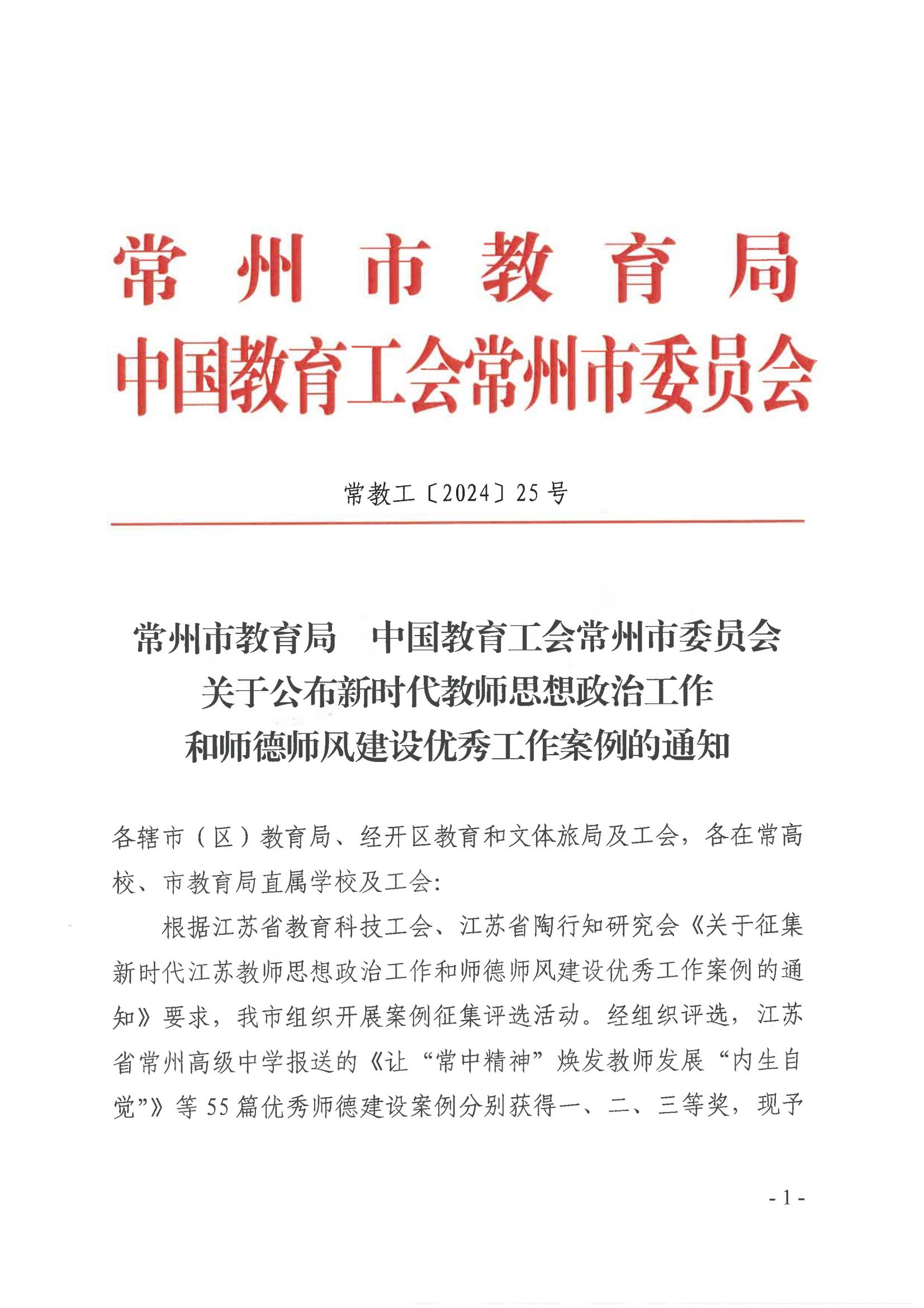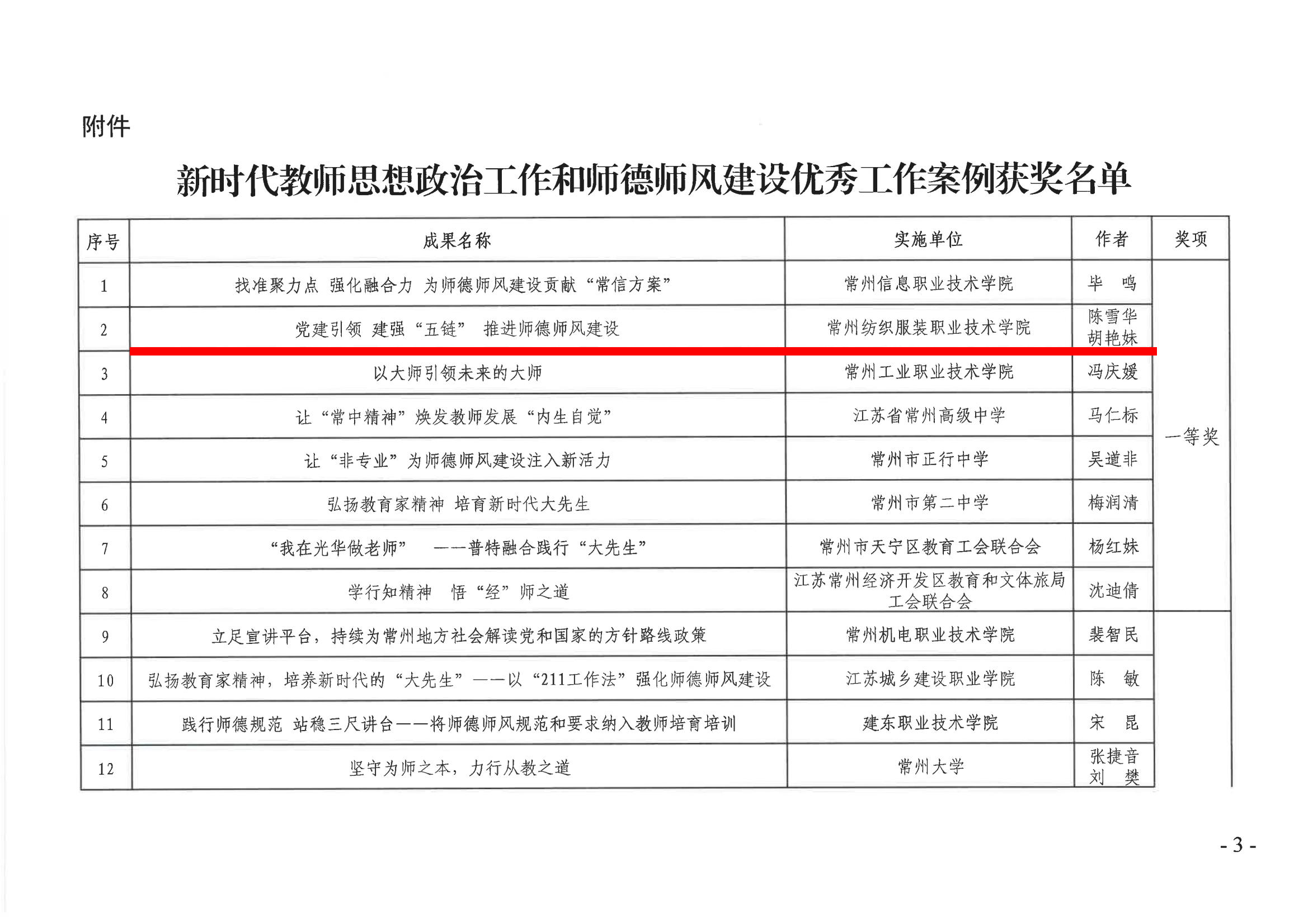 近日,从《常州市教育局 中国教育工会常州市委员会关于公布新时代教师思想政治工作和师德师风建设优秀工作案例的通知》中获悉,我校工会和党委教师工作部联合选送的《党建引领 建强“五链” 推进师德师风建设》工作案例荣获一等奖。