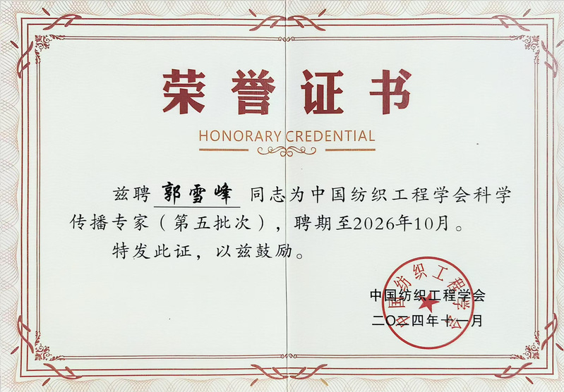 2024年11月21-22日,在东莞虎门召开的第四届全国纺织服装标准创新大会暨中国纺织工程学会标准化工作委员会年会上,我院获批中国纺织工程学会科普教育基地。另外,我院郭雪峰老师被聘为中国纺织工程学会科学传播专家。