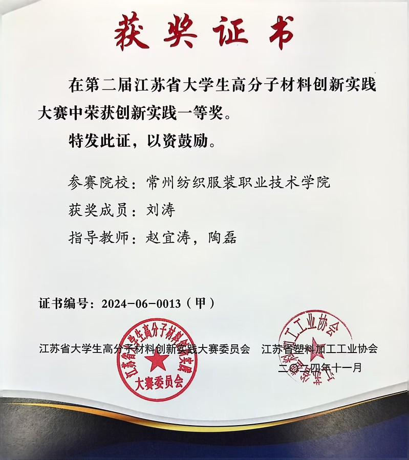 据悉,本次大赛由江苏省塑料加工工业协会主办,江苏理工学院承办,吸引了来自江南大学、西安工业大学、江苏科技大学等13个高校的15支团队同台竞技。大赛以“聚丙烯增韧”为主题,比赛历时三天,选手通过配方设计及优化聚丙烯进行增韧改性。裁判委员会从技能操作、成本核算、产品性能三个方面综合评分。经过紧张激烈的角逐,我校代表队凭借出色的表现荣获一等奖,领队刘涛同学荣获创新实践一等奖,指导老师赵宜涛、陶磊两位博士荣获优秀指导老师称号,大赛成绩充分展示了我校在高分子材料领域的实力和水平。