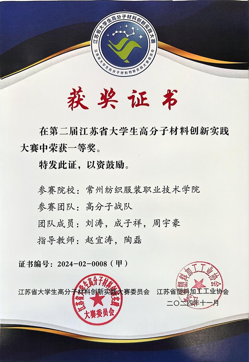 为深入推进我校高分子相关专业教学改革,培养大学生的创新精神、实践能力和应用能力,提高高分子相关专业的教学水平与人才培养质量,展示我校创新创业教育成果。日前,我校高分子材料智能制造专业学生代表队参加了第二届江苏省大学生高分子材料创新实践大赛。