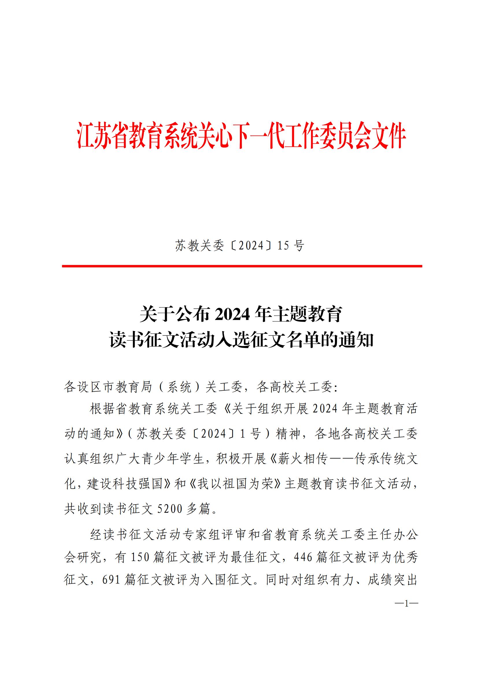 近日,江苏省教育系统关工委下发了《关于公布2024年主题教育读书征文活动入选征文名单的通知》苏教关委〔2024〕15号,我校推荐的智能纺织材料学院王宇勤同学作品《共绘盛世华章,致敬辉煌时代》(指导老师:应吉)获评优秀征文,智能纺织材料学院孙梦婕同学作品《科技织锦,文化承脉——以科技之力激活传统文化的生命力》(指导老师:鞠慧)和智能制造学院姚美梦同学作品《薪火相传,筑梦未来——谈中华民族的伟大复兴与我的努力方向》(指导老师:丁玺)分别获评入围征文。