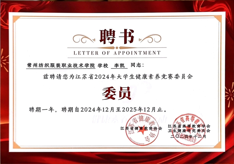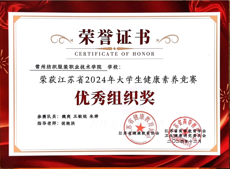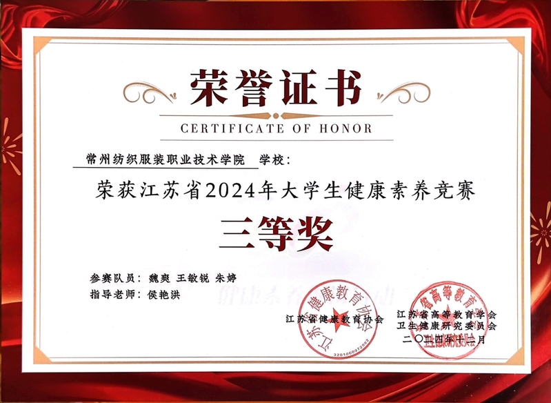 智能纺织与材料学院药品2334魏爽、纺织2332朱婷和创意学院产品2331王敏锐组队参赛,后勤保障部侯艳洪担任指导教师,最终团队入围决赛并获得团体三等奖,学校获得优秀组织奖,我校后勤保障部部长李凯获聘“江苏省2024年大学生健康素养竞赛委员会委员”。