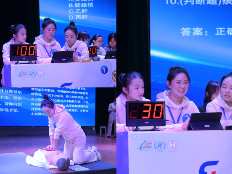 决赛由“知识竞赛+技能竞技”两个部分组成。知识竞赛中,选手们围绕必答题、抢答题、视频找错题及风险题展开激烈角逐;技能竞赛为七步洗手法和心肺复苏,通过模拟真实场景考核参赛选手的健康管理和应急处理能力,我校选手在比赛中展现出了扎实的健康知识和熟练的操作技能。