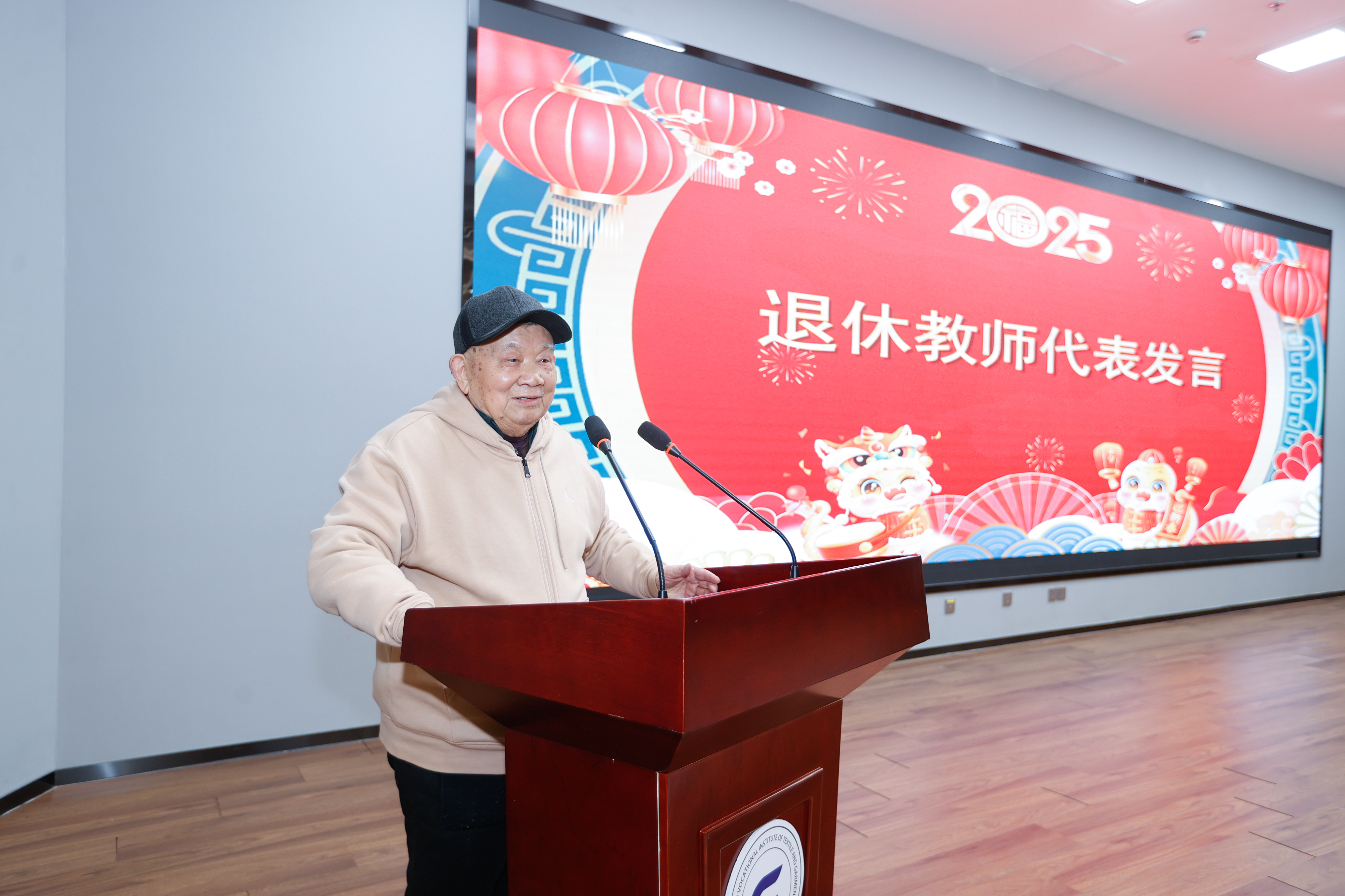 团拜会现场,高江荣、胡艳妹、顾广涛为今年9位七十岁的退休教师送上鲜花和生日祝福。退休教师代表、老校长金小坡代表退休教师发言,感谢学校对老同志的关心,老同志们将始终关心、支持学校的发展建设,期望退休老同志们能够发挥余热、老有所为,继续为学校建设贡献力量。祝贺学校一年来取得的成绩,祝福学校在党委的领导下一天更比一天好。