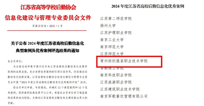 由江苏省高校后勤协会信息化建设与管理专业委员会举办的“2024 年度江苏省高校后勤信息化优秀案例评选”活动公布了评审结果,经会员单位申报、专家遴选,我校成功入选“2024年度江苏省高校后勤信息化优秀案例”。