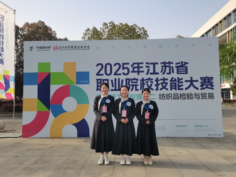 4月9日,纺织品检验与贸易赛项在苏州经贸职业技术学院收官。李春月、施睿明、陈婷婷三位同学在团队协作与个人实操环节均表现优异,全省总排第三名,荣获二等奖。该赛项包含纺织品检验操作、贸易汇报展示、贸易实操(随机抽选独立完成)三大模块,备赛过程中,纺检专业指导教师团队(邵东锋、杨静芳等)针对新赛制强化分组训练,确保每位选手既能协同作战,又能独立胜任关键任务。