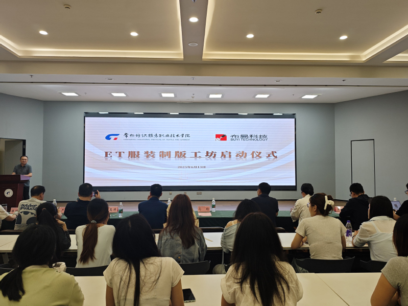 会议伊始,马昀就服装制版工坊的行业赋能价值与人才孵化意义发表欢迎致辞,系统阐释工坊作为对接产业需求的匠心孵化载体、深化校企协同的实践创新平台,如何以技术赋能推动专业建设与学校品牌产业的共生发展,在擘画学科生态构建与产教融合创新蓝图的同时,向与会嘉宾致以热忱的合作愿景。随后,马昀和赵文共同为“ET服装制版工坊”揭牌。接下来,赵文以“精益求精,共创共赢”为核,介绍了上海布易科技有限公司及产品应用情况;2024级服装智现场工程师班代表李苏宁分享了本学期项目化课程学习、技能进阶与工匠精神体悟;孙嵩涛介绍了ET服装制版工坊运营方案,通过设备集群管理、校企订单孵化等内容,表达了实现技术匠心与共创价值的校企深度融合的拳拳渴盼。