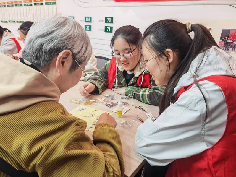 学工党支部书记张梦珺向老年人介绍了部分常见中药材的养生功效,针对老年人常见的健康问题提出了“药食同源”的饮食建议,帮助老人提升自我保健能力。随后,老服专业学生志愿者充分发挥专业优势,围绕中医养生主题与老人们进行了亲切交流,并开展有趣的手工DIY活动,协助老人选择主题材料、设计构图布局,在欢声笑语中共同制作出一幅幅精美的中药画。