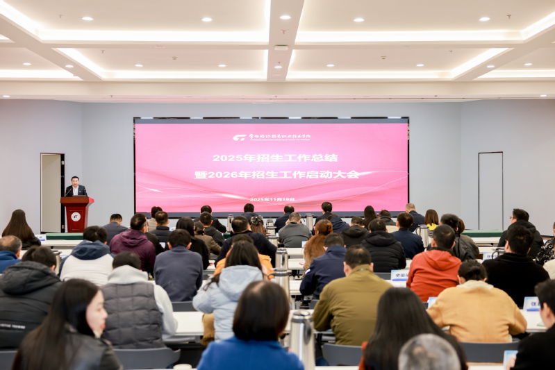 11月19日下午,我校在领秀展厅召开2025年招生工作总结暨2026年招生工作启动大会。全体校领导、各二级学院(部)、职能部门领导及教职工代表参加会议。大会由招生就业处副处长蒋云松主持。