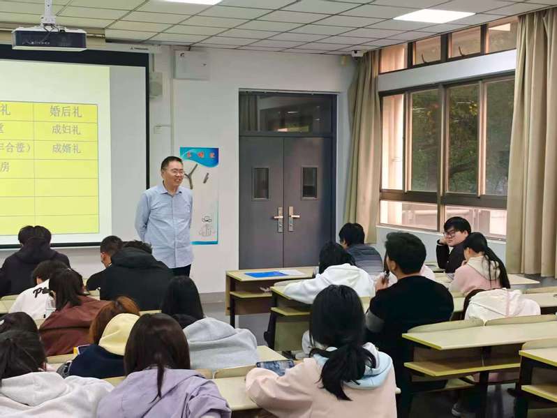 讲座中,鲍庆忠从婚聘之礼、婚典议程、婚后礼仪等三方面,辅以生动有趣的历史故事及文学典故,将原本枯燥的古礼讲述得引人入胜,以其深厚的学养、幽默的语言和独特的视角,将博大精深的中国古代婚姻文化娓娓道来,为同学们打开了一扇窥探古人生活与精神的窗口。讲座尾声的互动环节,同学们也热情发言,就如今不同地区的婚俗与鲍老师进行了深入交流。