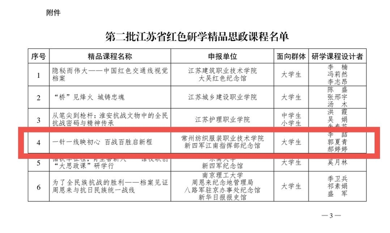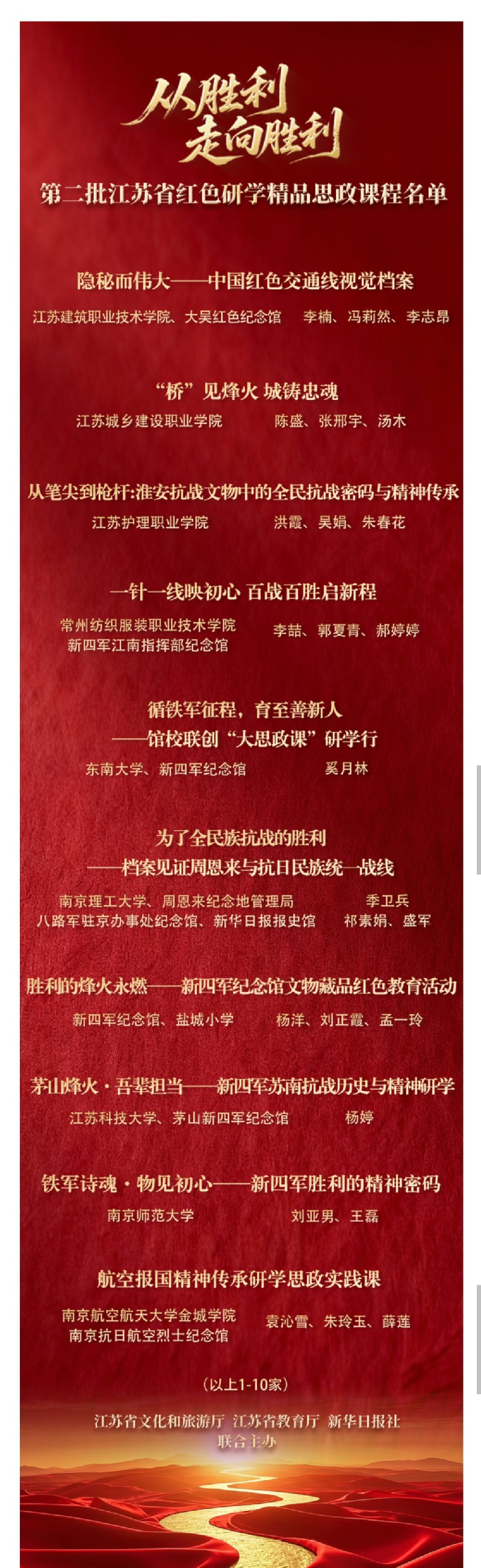 近日,江苏省文化和旅游厅、江苏省教育厅和新华日报社共同发布《关于公布第二批江苏省红色研学精品思政课程名单的通知》。我校马克思主义学院与新四军江南指挥部纪念馆共同打造的《一针一线映初心百战百胜启新程》课程成功入选,并在评选中取得总分第四名的好成绩。