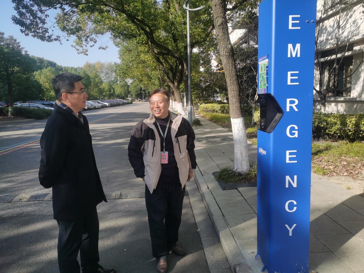 保卫处处长罗卫东向检查组介绍校园一键报警系统