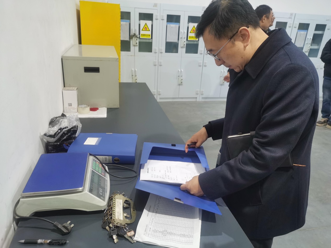 检查组仔细检查危化品仓库台账