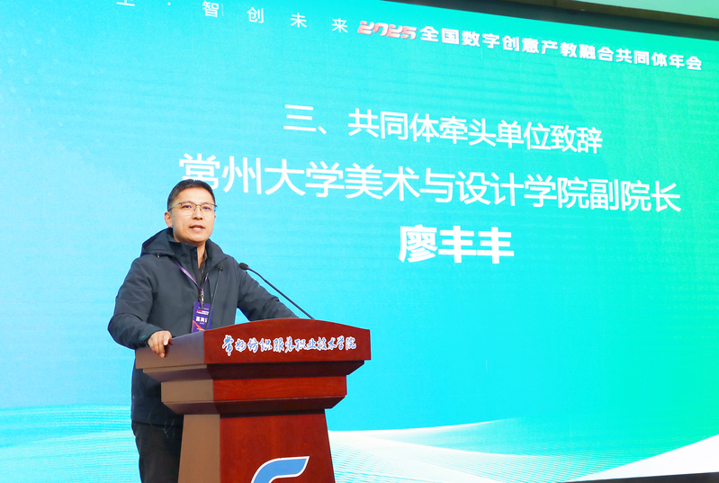 常州大学美术与设计学院副院长廖丰丰教授介绍了常州大学近年来在产教融合方面取得的成就,以及一年多来,数字创意产教融合共同体在数字创意人才培养、资源共享、师资培育、项目合作领域取得的成绩。他强调,面对机遇与挑战,要以更加务实的行动深化产教融合:一是聚焦“需求导向”让人才培养与产业升级同频共振;二是强化“创新驱动”,让数字技术攻关与成果转化双向赋能;三是深化“生态共建”,让院校资源与企业需求深度耦合,真正实现“教育服务产业、产业反哺教育”的良性循环。