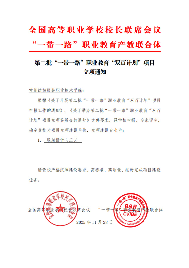 近日,全国高等职业学校校长联席会议、“一带一路”职业教育产教联合体正式公布第二批“一带一路”职业教育“双百计划”项目立项名单,我校凭借扎实的产教融合基础、清晰的国际化发展思路及优质的项目申报方案,在激烈竞争中脱颖而出,服装设计与工艺专业成功获批立项建设,标志着我校职业教育国际化发展迈入新阶段。