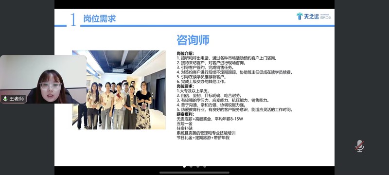 江苏云巨石科技有限公司沙经理从企业概况、行业前景切入,详解“双通道”成长体系与五险一金、带薪培训等福利。她重点介绍了课程顾问岗位,明确了岗位所需的沟通、客户管理等能力及工作考核要求,助力学生精准匹配。随后,常州天之远教育科技有限公司王老师介绍企业优势与发展规划,呈现“基层—骨干—管理”的晋升路径,以及“一对一导师带教”等培训制度。她着重介绍了咨询师、教务老师岗位,明确了岗位职责与能力要求,为学生提供多元选择。