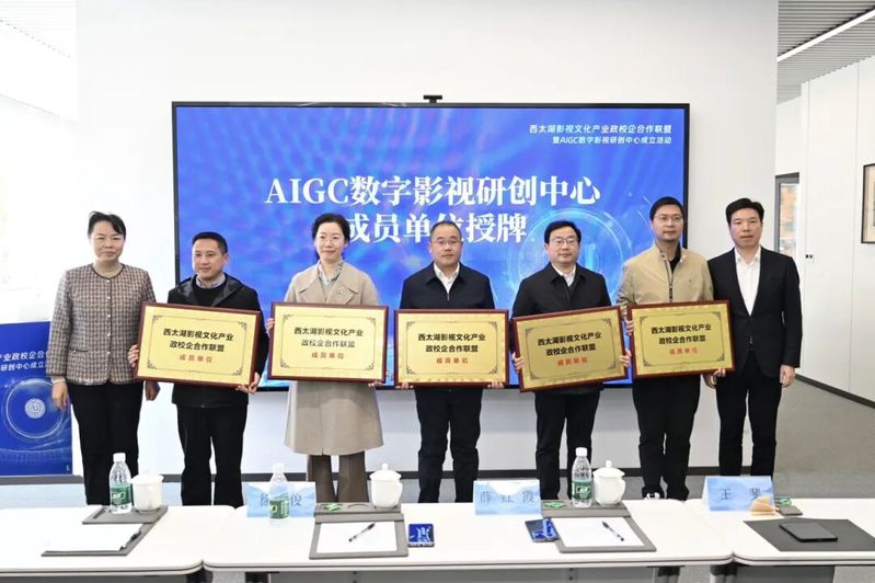12月6日,西太湖影视文化产业政校企合作联盟暨AIGC数字影视研创中心成立活动在西太湖青年中心举行,创意设计学院受邀参会并成为联盟首批成员单位,获得授牌。