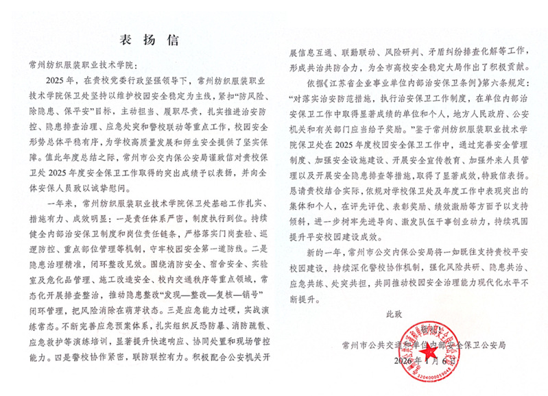 近日,常州市公共交通和单位内部安全保卫公安局向我校发来表扬信,对我校保卫处在2025年度治安保卫工作中取得的突出成绩予以通报表扬,并向全体安保人员致以诚挚慰问。这份来自公安机关的正式认可,充分体现了我校在平安校园建设方面取得的扎实成效。