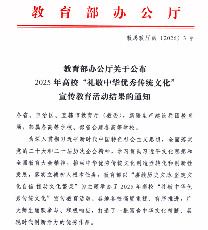 “礼敬中华优秀传统文化”宣传教育活动由教育部思想政治工作司牵头主办,是教育部立足中华优秀传统文化传承发展,持续加强高校传统文化教育、深化校园文化建设的重要长效举措,旨在推动中华文脉在校园落地生根、薪火相传。2025年活动共遴选全国高校优秀作品305项,江苏省高职院校共有13个项目入选,我校2项作品入选位列江苏省高职院校第二位,实现重大突破,充分展现了学校在文化育人领域的扎实积累和创新探索。