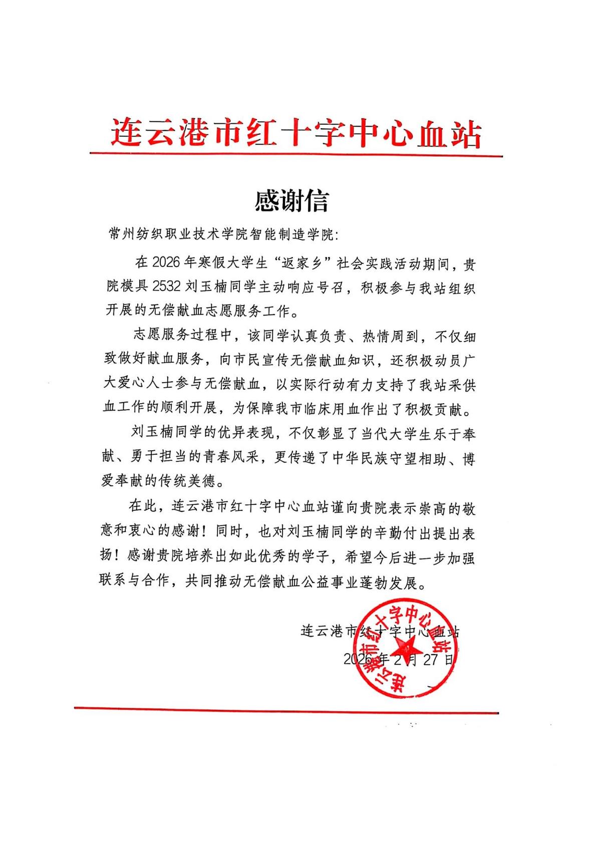 近日,智能制造学院收到了一封来自连云港市红十字中心血站的表扬信。信中,血站对模具2532班刘玉楠同学在2026年寒假大学生“返家乡”社会实践活动期间的优异表现给予了高度赞扬,并对学院在培养担当奉献精神方面的工作表示衷心感谢。这封表扬信不仅是对刘玉楠个人志愿服务工作的认可,更是对学院实践育人成果的充分肯定。