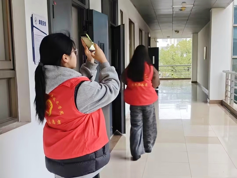 行动中,志愿者们对教学楼各项教学设施的运行状况、外观完好度及周边环境安全进行了全面巡检。志愿者严格遵循“定位+描述+拍照”的规范流程,对发现的设施故障、消防通道占用及安全标识破损等问题进行详细记录,并第一时间汇总整理,反馈至学校相关职能部门,为后续的精准维修与整改提供了有力支持。