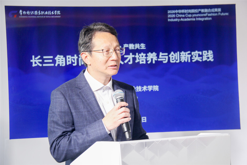 论坛第一环节,洪霄以“数智赋能・产教共生——长三角时尚产业人才培养与创新实践”为题作主旨报告。他指出,当前时尚产业正经历数智化与绿色化双重变革,长三角作为中国时尚产业规模最大、产业链最完整的区域,承担着引领高质量发展的重要使命。他强调,产教融合不再是选择题,而是必答题;不再是浅层次合作,而是急需深层次的生态重构。他指出,企业的用人痛点集中体现为“招聘难、培养贵、留不住”,而职业院校必须直面“专业设置能否对接产业需求、课程内容能否跟上技术迭代、实训场景能否还原真实产业环境”的自我拷问。他提出,未来的产教融合必须是标准共定、资源共享、人才共育、成果共赢的生态体系,推进教育链、人才链、产业链、创新链“四链融合”。并提出“十五五”期间学校将加快建设纺织劳模精神传承基地、具身机器人服装研发中心等重点项目,全力打造长三角时尚产业人才培养与技术创新核心阵地。