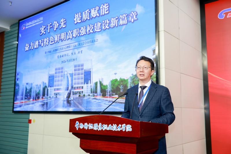 大会在雄壮的国歌声中开幕。党委副书记、院长洪霄向大会作《实干争先提质赋能奋力谱写特色鲜明高职强校建设新篇章》的工作报告,全面回顾了2025年及“十四五”时期学校在政治引领、人才培养、内涵建设、产教融合、人才引育、科研攻关、文化传承、职教出海、内部治理、民生福祉等十大方面取得的突出成绩,客观分析了当前面临的机遇与挑战。