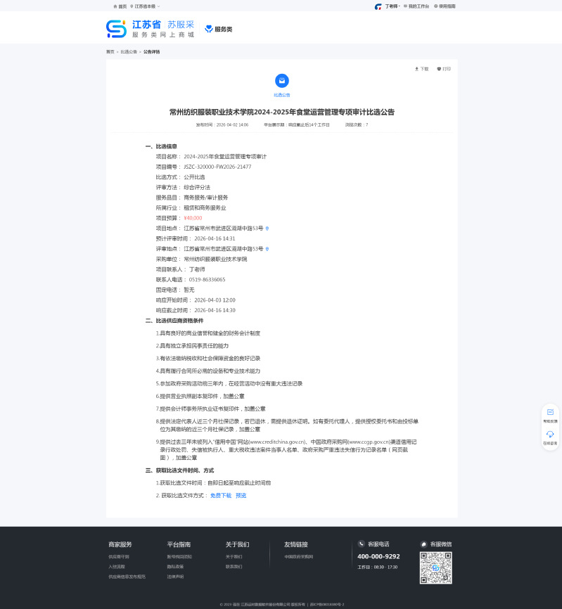 【采购公告】2024-2025年食堂运营管理专项审计项目比选公告