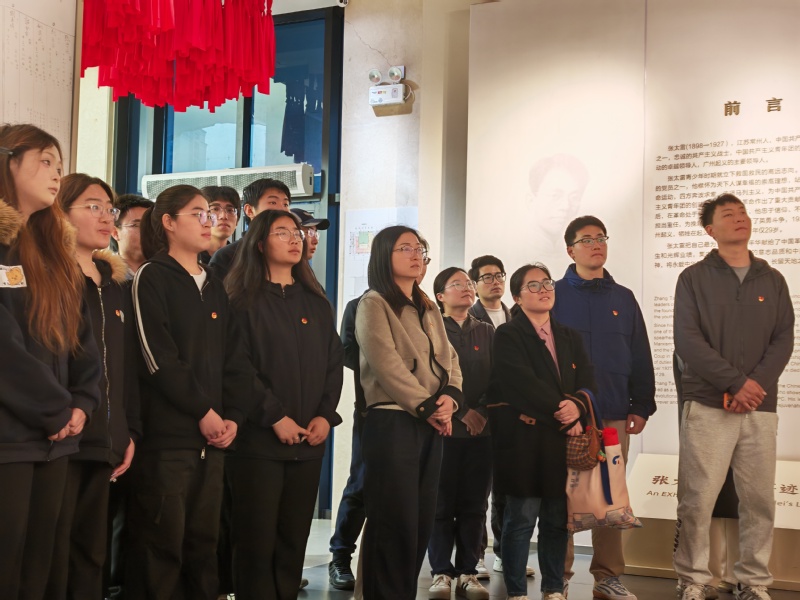 随后在讲解员的引导下,依次参观了“谋天下、谋国家、谋未来”主题展厅。一张张珍贵的历史照片、一件件斑驳的革命文物、一段段感人的文字记载,生动再现了张太雷同志短暂而光辉的一生。从五四运动的先锋到建党建团的骨干,从国际舞台的亮相到广州起义的壮烈,张太雷用29年的青春热血,践行了为党和人民奋斗终身的铮铮誓言。参观过程中,师生们不时驻足凝视,认真聆听讲解,深入了解张太雷同志的革命历程和思想脉络。大家被革命先辈坚定的理想信念、无畏的牺牲精神和崇高的家国情怀深深打动,思想上受到了一次深刻的红色洗礼。